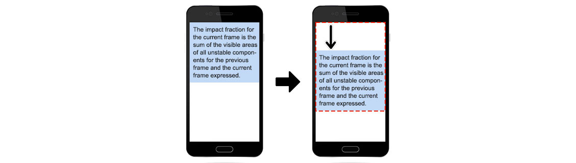 There’s an aspect in the picture above that takes up half of the viewport in one frame. The element then shifts down by 25% of the viewport height in the next frame. The red, dotted rectangle represents the element’s apparent region in both frames, which is 75 percent of the overall viewport in this instance, giving it an impact fraction of 0.75..