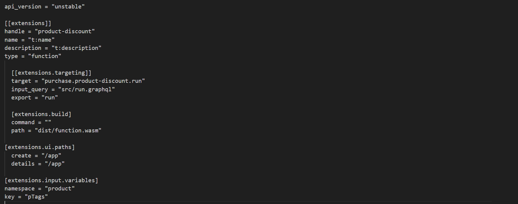 Incorporate metafields namespaces and keys into the extensions.toml file. These metafields store input variable values, ensuring consistency across Shopify Function executions.