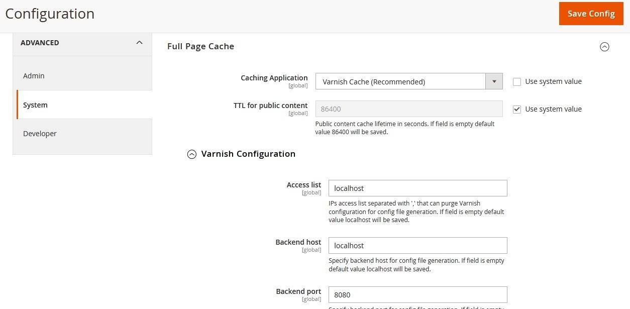 - Go to Stores > Configuration > Advanced > System > Full Page Cache