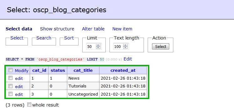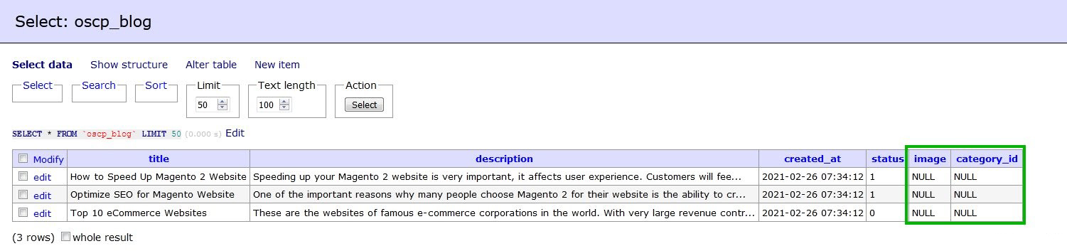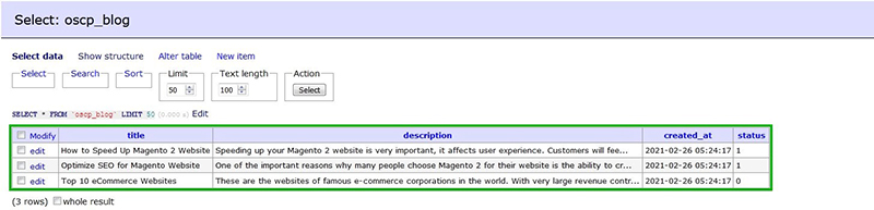 We will create a table name magetop_blog with fields: id, title, description, created_at, status.