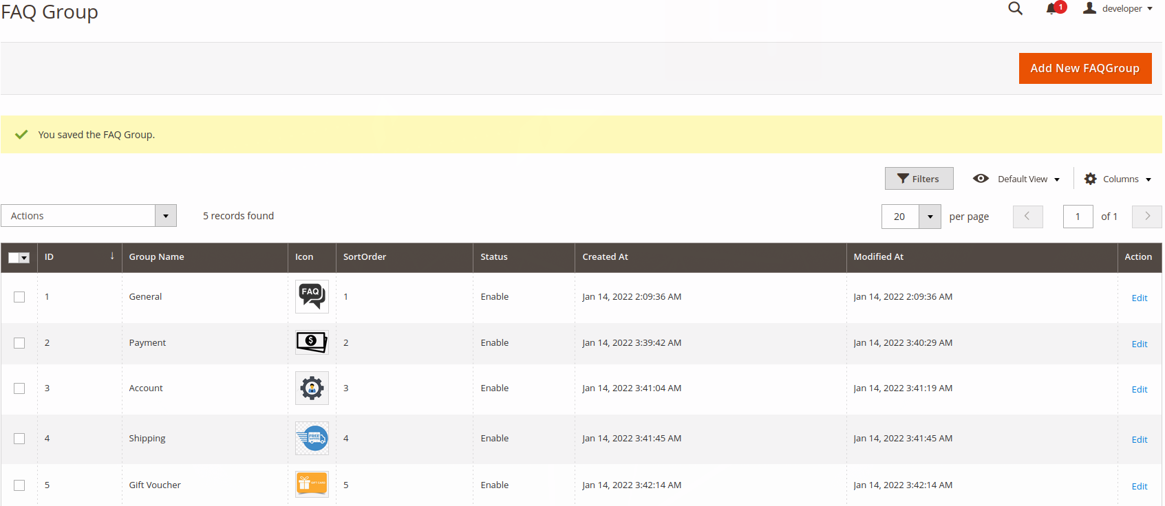 Manage FAQGroup – To create a new FAQ group, click on the Add New FAQGroup button on the top-right of the page.