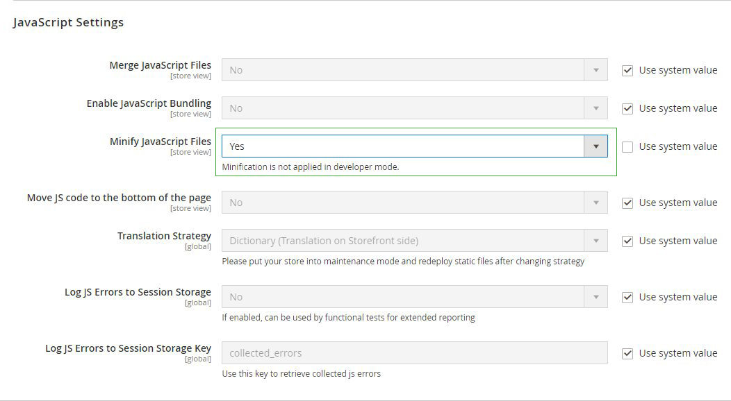 i) Backend > Stores > Configuration > Advanced > Developer > Javascript settings