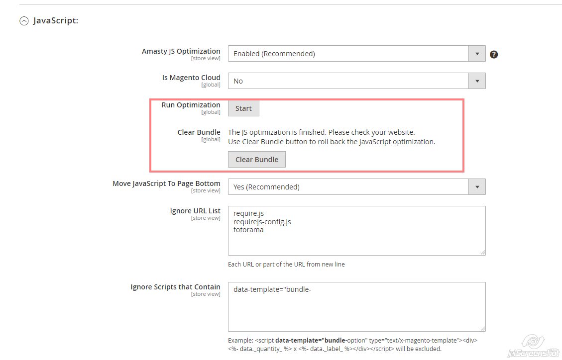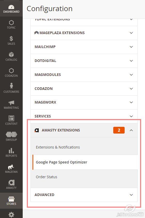 ii) Backend > Store > Configuration > Amasty extension > Google Page Speed Optimizer > Settings > Javascript Setting
