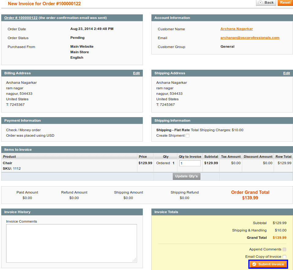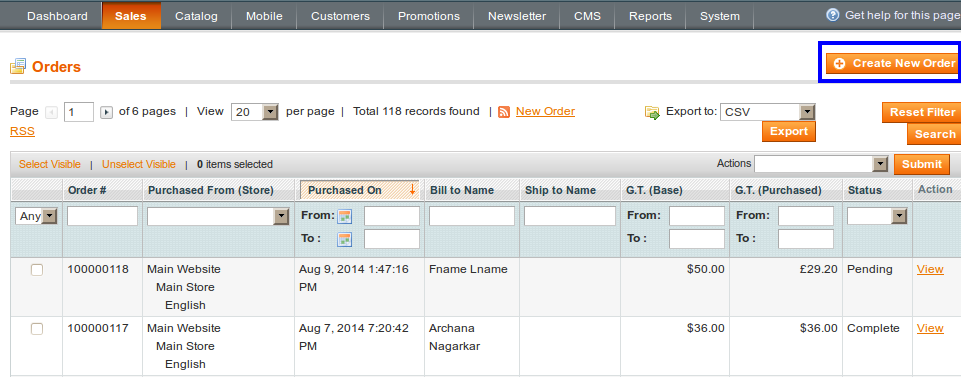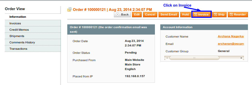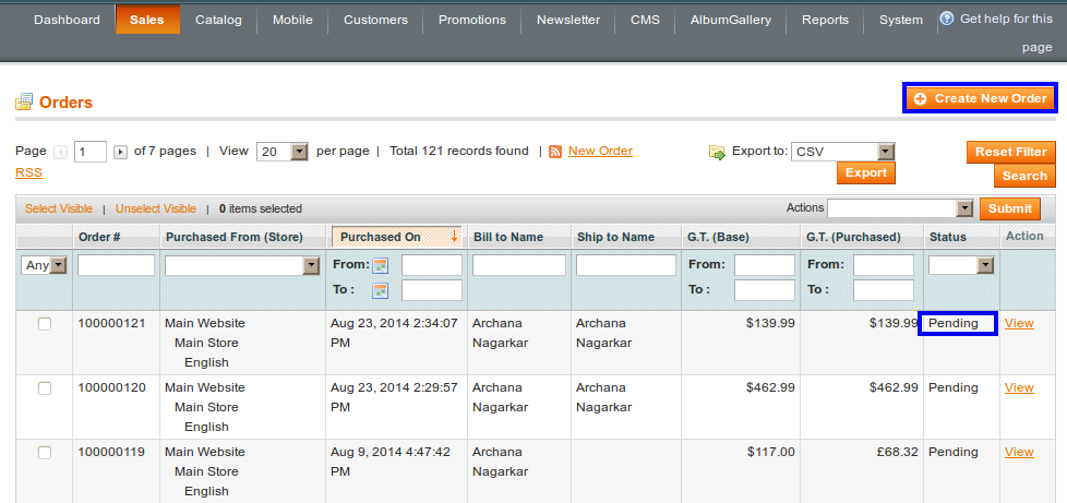 From here you can create new order or change your order status (Pending) to Complete by creating Shipment and Invoice for that order.Step 2. Create and Submit Invoice