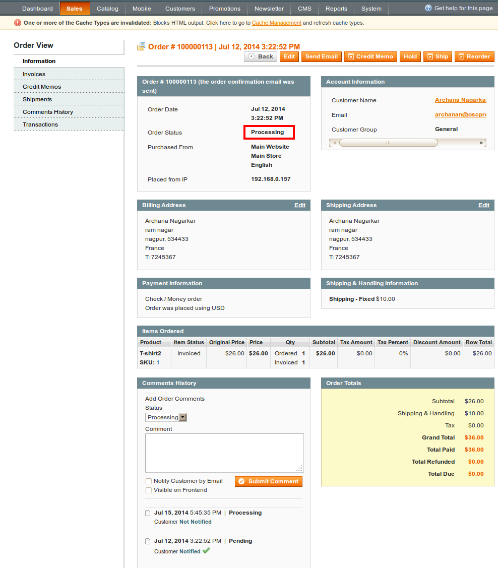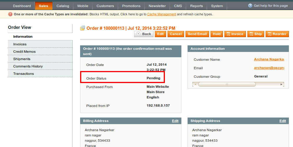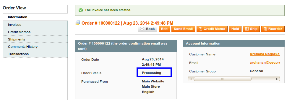 From here you can Cancel, Edit, Create Invoice, Create Shipping, Reorder the order.