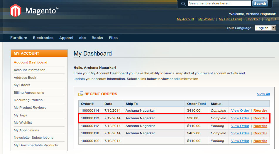 You can view your order in front-end by Login into your account. Click on My Order-list will show list of orders. Customer can Reorder from their account.