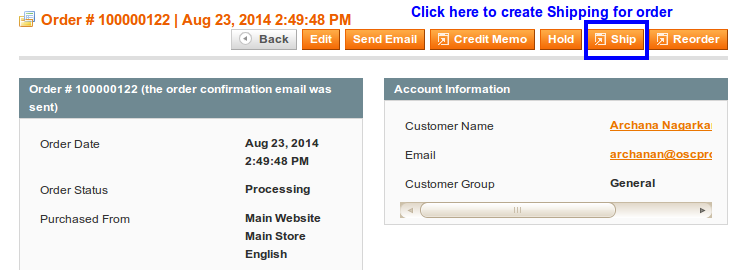 After Invoice creation for our order then we can ship this order, by clicking on Ship tab appear on right corner. After submission of Shipping your order process become complete.