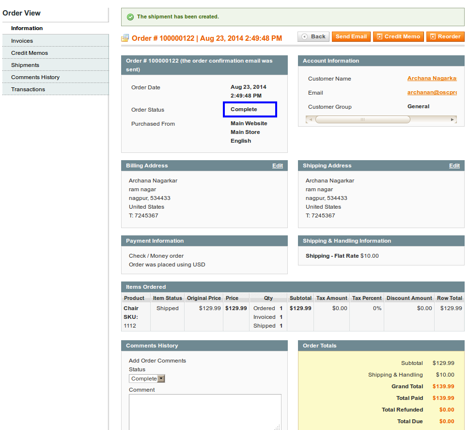You can see your Order details by clicking on View Order link, also you can see the Shipment and Invoice information.