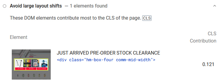 PageSpeed Insights – the “avoid big layout shift” report on your Diagnostics section shows you which individual elements have the biggest CLS contribution, along with an image of them.
