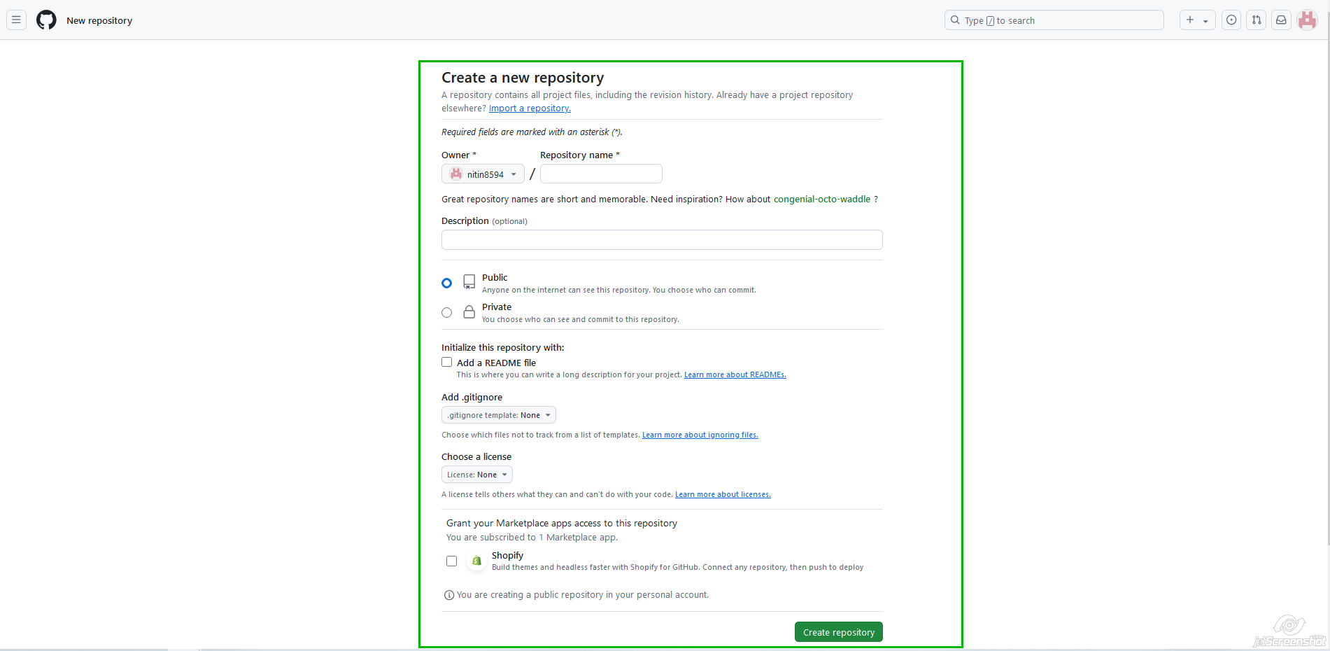 After creating a git account you need to create a repository for adding theme files. For this Click on New and fill required information.