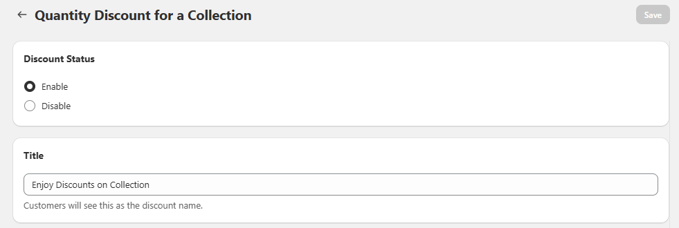 5. Enter a title in the Title bar, which will be displayed as the discount name on the cart and checkout page.