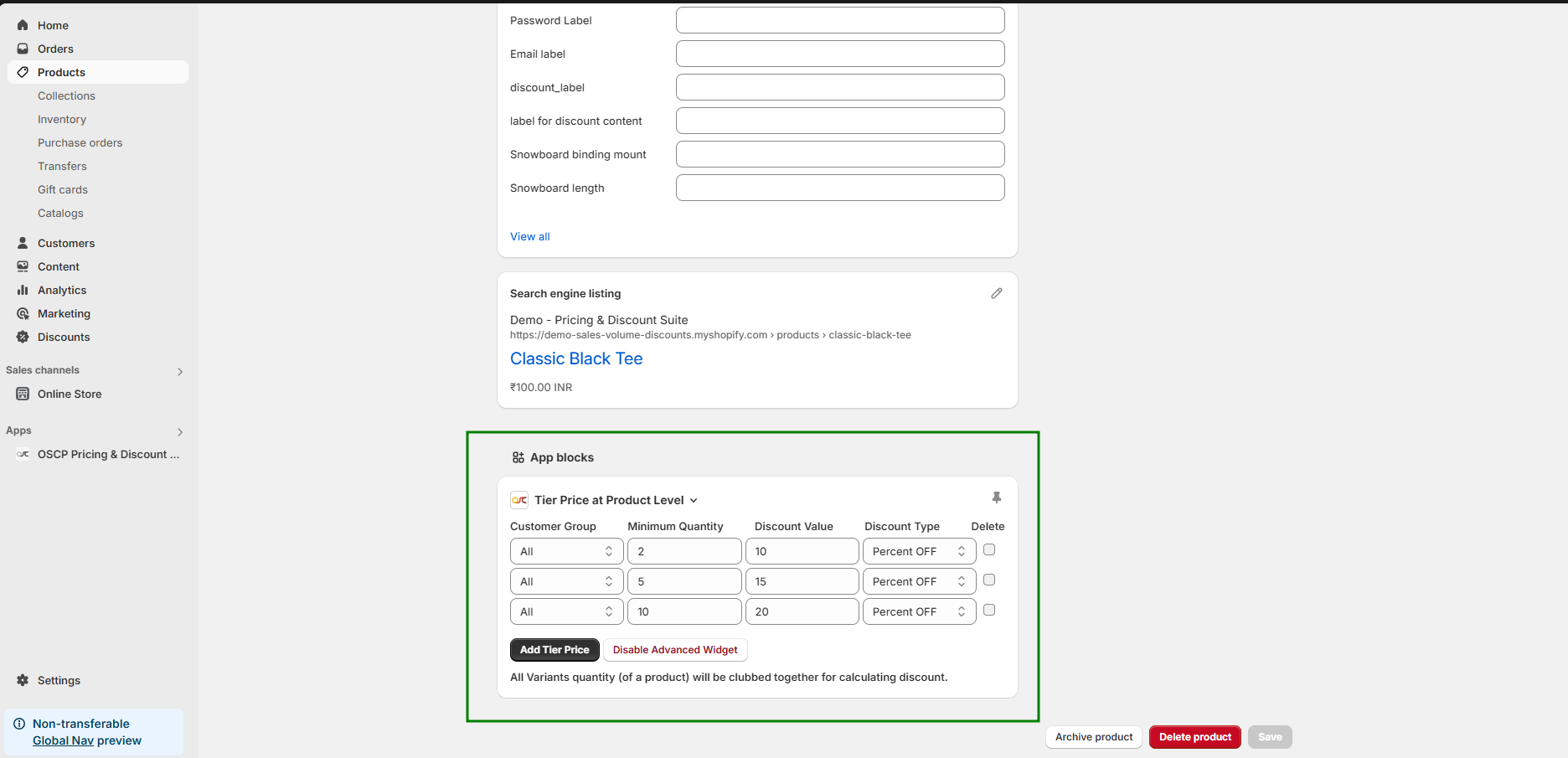 6. Scroll down the product page you will see the App Block section In which you have to click on + App Block and then select additional_settings & pin it => Click on Add New Rule => Select the Customer group where you want to apply a discount . Enter the minimum quantity and special discount in Percent Off, Amount Off or Fixed Price according to your needs.=> click on Save button.