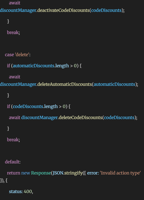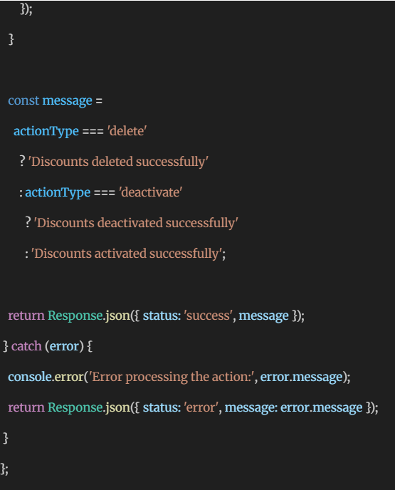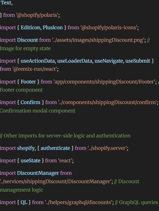 To facilitate tailored, secure, and streamlined checkout procedures, Shopify utilizes Polaris components such as DataTable, Badge, and Checkbox for Discount Rule Visibility management. GraphQL loaders are used to dynamically load rules, and action handlers are created for enabling, disabling, and deleting them. In addition, a confirmation modal is included to make deletions secure, providing store admins with the necessary tools for scalable and business-centric discount rule management.