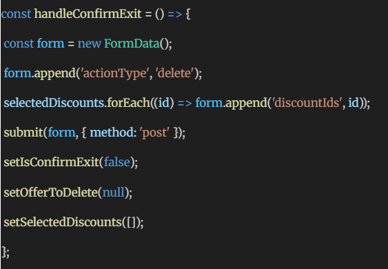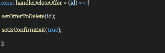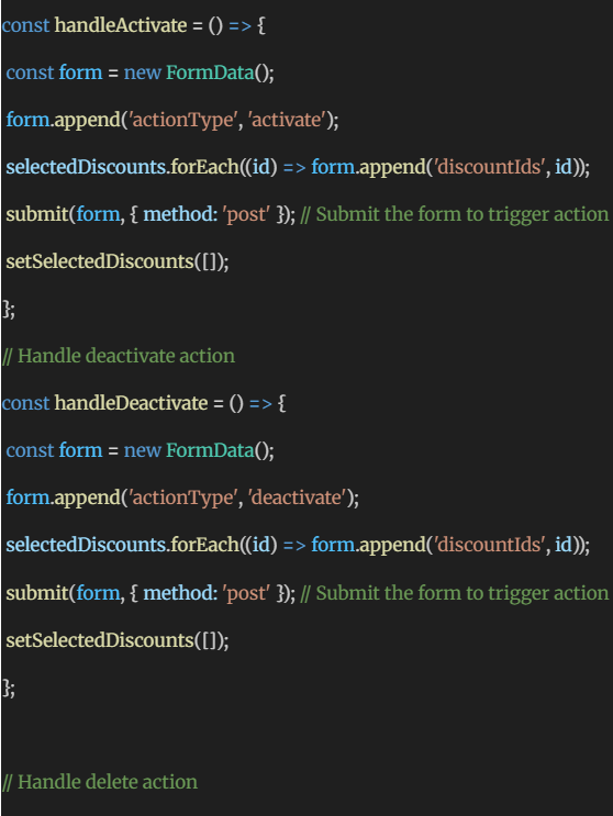 Other handlers like handleDeactivate and handleDeleteOffer follow similar logic, updating state and submitting form data.