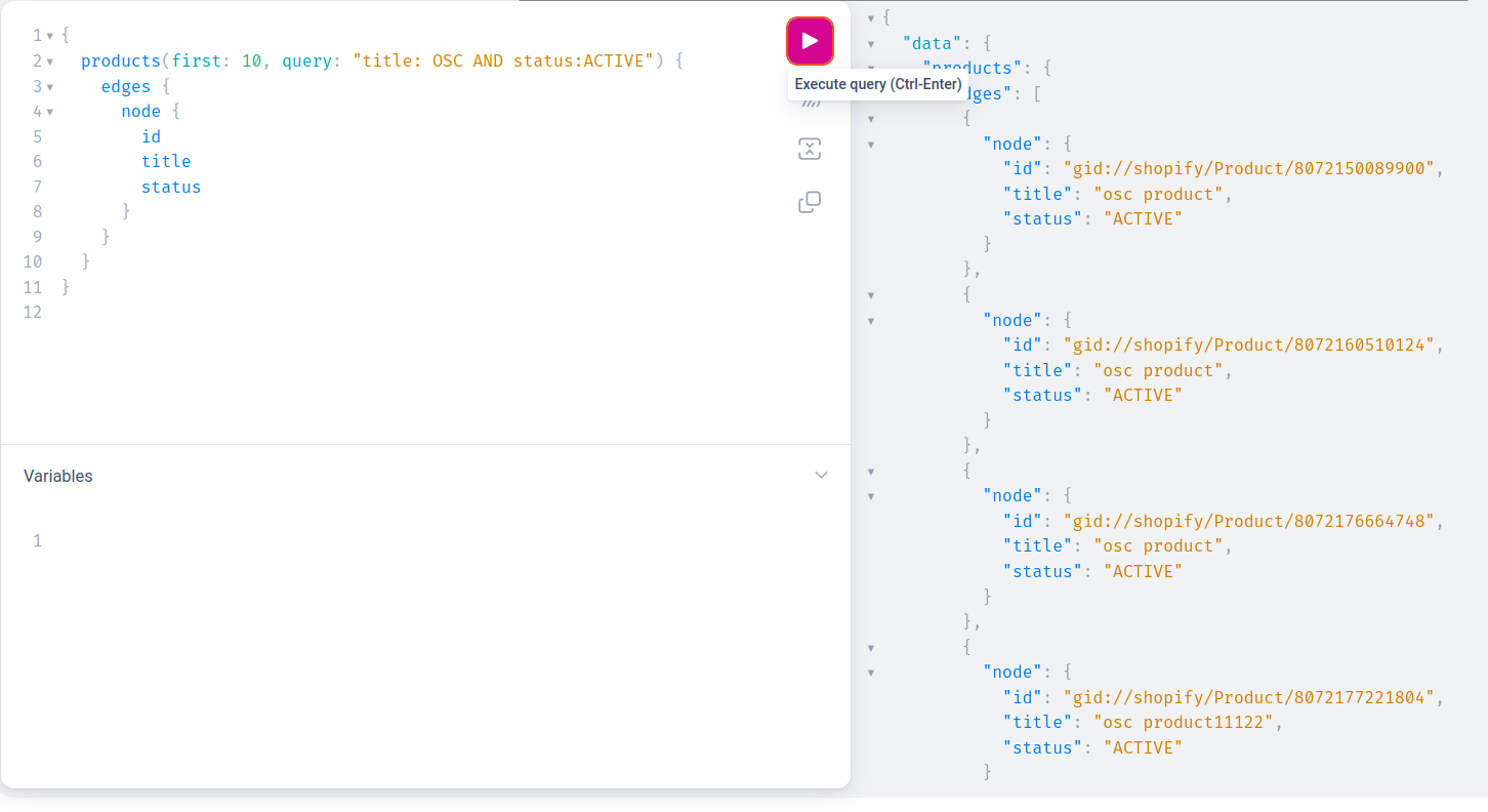 You can use operators like AND and OR to combine different filters. For instance, retrieve products with a title starting with “OSC” and a status of “ACTIVE.”