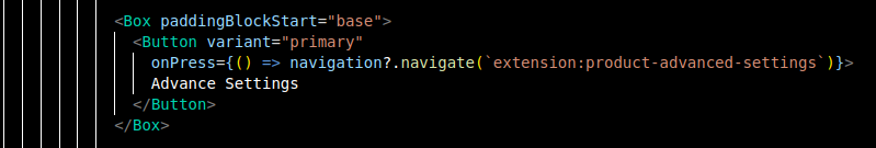 While attempting to navigate from the “Advanced Settings” in the Admin Block Extension to specific routes within our app, we encountered a limitation: direct navigation is not possible since the extension components operate within a different library, @shopify/ui-extensions-react/admin.