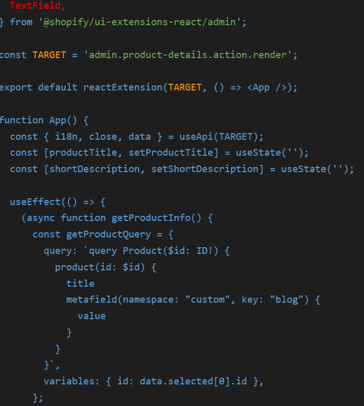 - Admin Action Extensions and blogs: The Shopify admin prevents the use of extensions because they lack the capability to manage or target metafields which belong to blog resources.