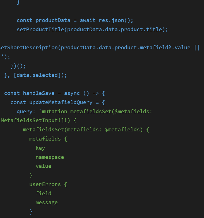 This React component functions as an interface which interacts through Shopify Admin API both to retrieve metafields and modify them.