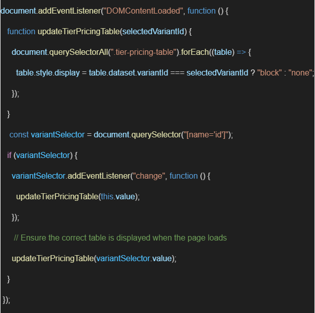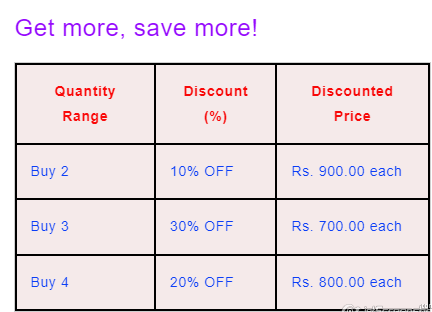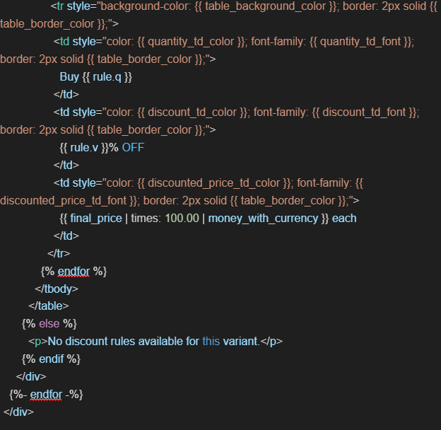 The Shopify Liquid template constructs an interactive price schedule for product versions to provide improved purchasing options to customers.  Customers will find discounted prices displayed through this table as the quantity increases in order to stimulate bulk purchasing habits.  Revenue control is optimized because the platform adjusts pricing automatically between guest users and logged-in users for strategic promotional purposes.