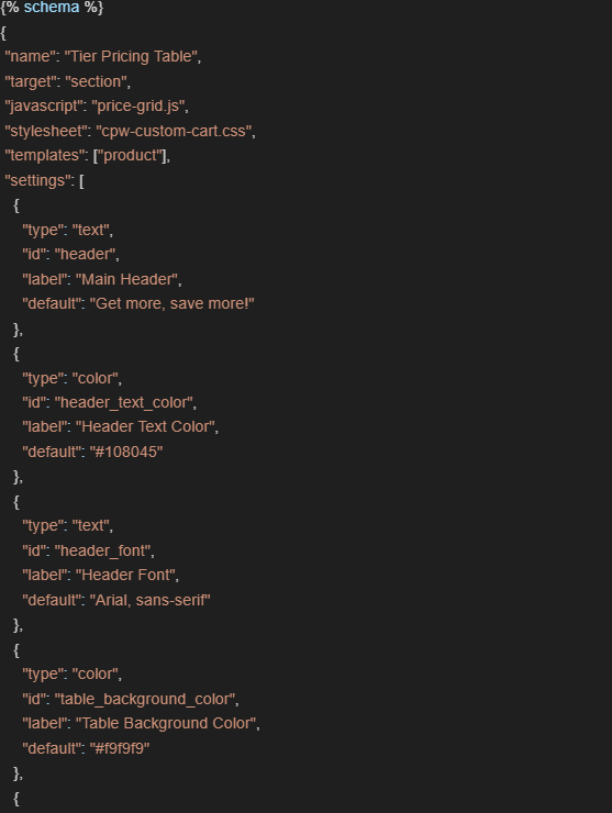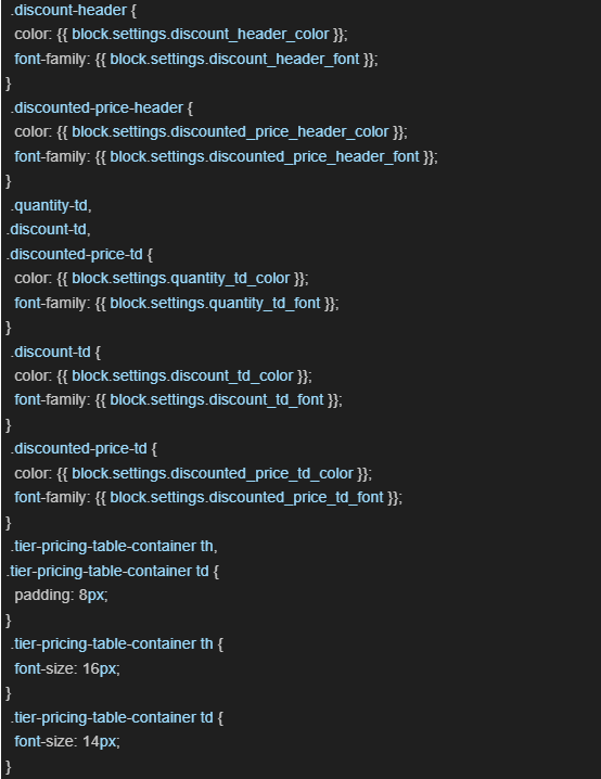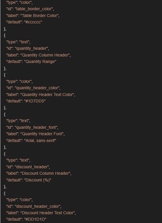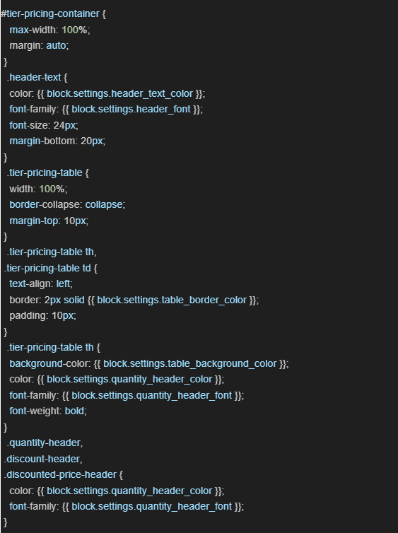 Through the Shopify Theme Editor merchants gain full control to modify how the table functions and appears.  Store owners can define quantity bands with attached discounts or fixed prices during their customization of the pricing table to ensure it blends with their store appearance.  This template includes schema settings that enable effortless modification of pricing tiers along with display options and textual content without needing code modifications.  Mercantile operators use this feature to build advanced pricing deals that drive customers to buy in bulk while boosting their order conversion metrics.