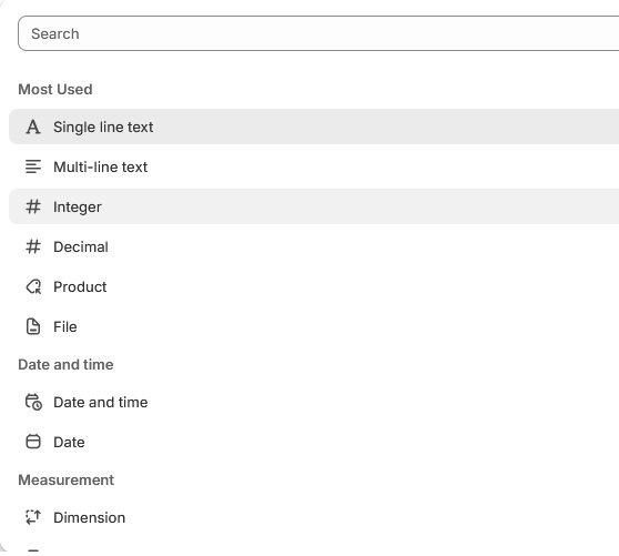 - Choose an item from the list of supported objects (Product, Collection, Customer, etc.).