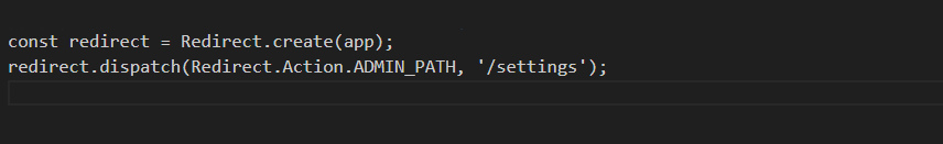 To redirect users to a page within the Shopify Admin (e.g., settings page), use the following code: