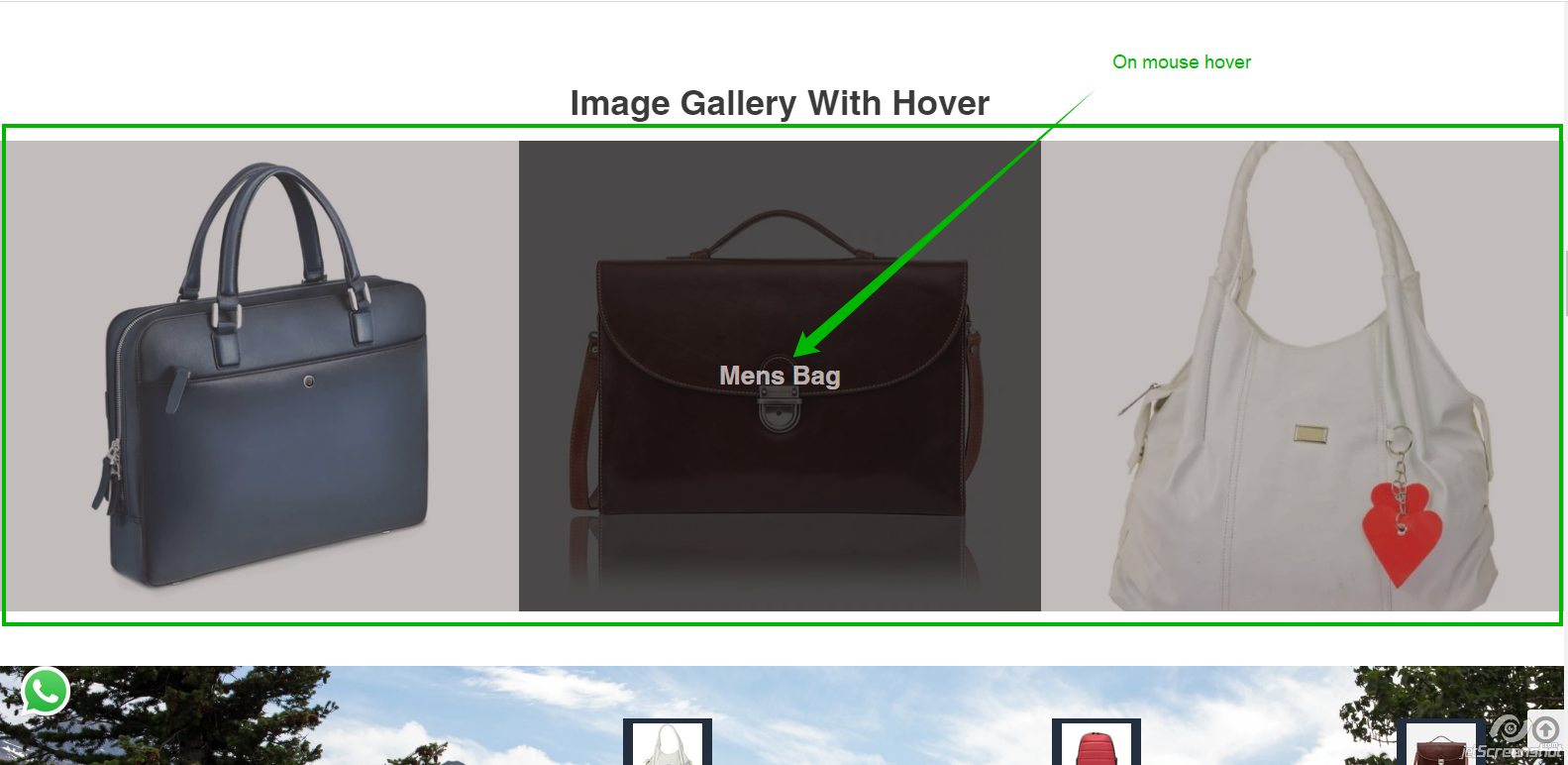 This section creates a 3 image gallery with a hover effect, which can be customized for 4 images and 2 images as well, in that title is displayed on hover. Such a gallery is very attractive and manageable.