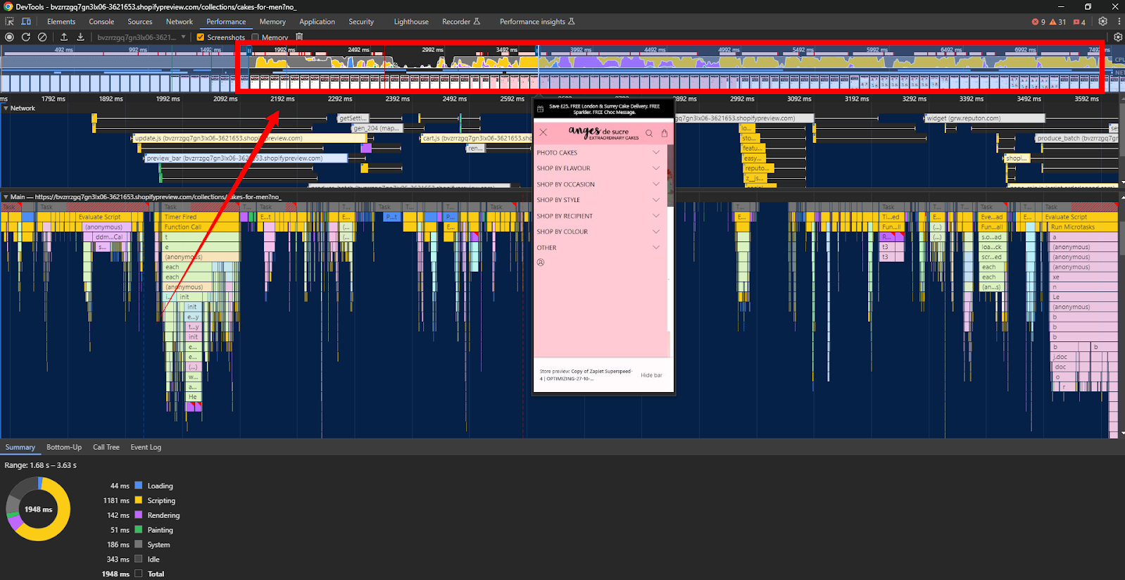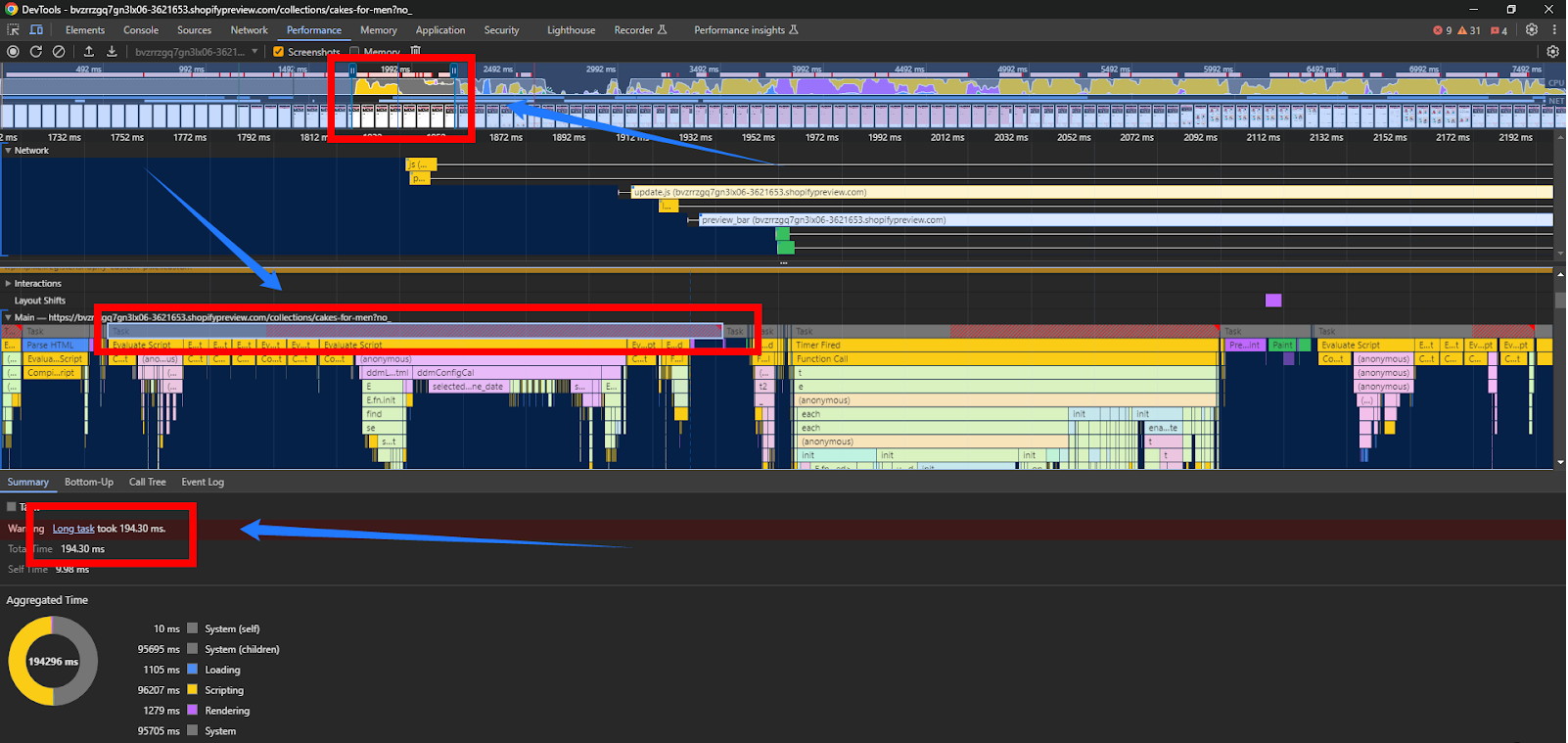 Pay attention to highlighted areas in the Performance tab that indicate delays in specific functions. Use DevTools to dive deeper into script evaluation times while continuously navigating your Shopify store to monitor performance.