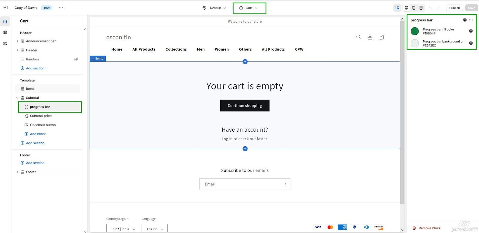 Next, you need to incorporate the discount progress bar into your theme’s cart page. Here’s how you can do it with the DAWN theme: