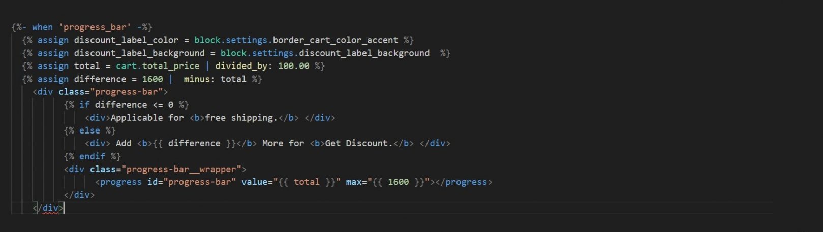 This snippet sets up a progress bar that updates in real-time as the customer adds items to their cart.