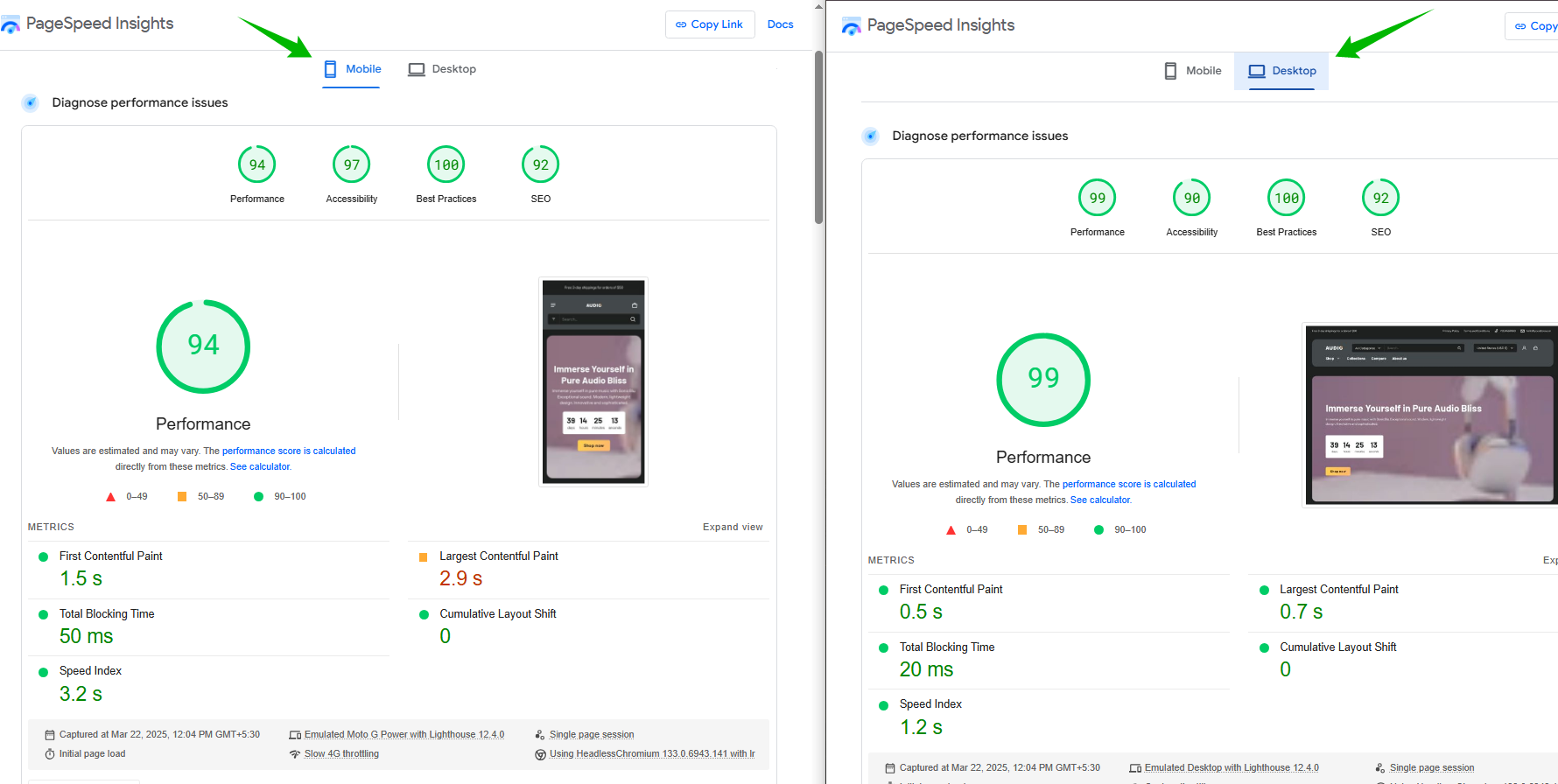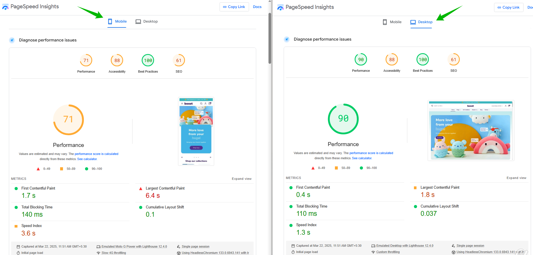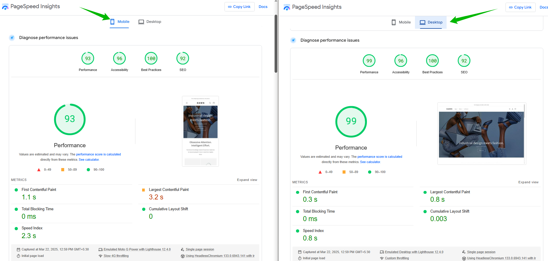 An assessment of performance can be seen in the following PageSpeed Insights results for mobile and desktop.