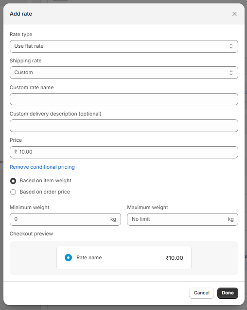 - Weight-Based Shipping: Charges are based on the total weight of the products.