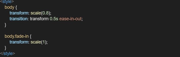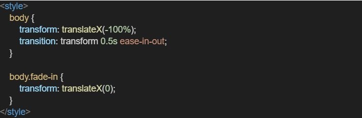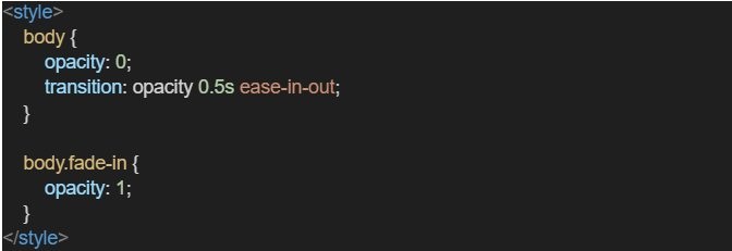 This CSS sets the default opacity of the body to 0 (fully transparent), and it defines a transition effect on the opacity property to take 0.5 seconds to complete. The class .fade-in makes it fully opaque – fully visible.