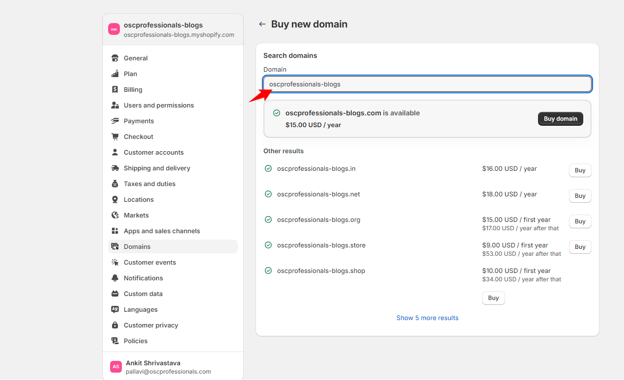 Use the search feature to look for an available domain. If your desired domain is available, you can simply buy it. Once your domain is purchased, you will be able to personalize your Shopify tracking link for order-tracking purposes and other customer communications.