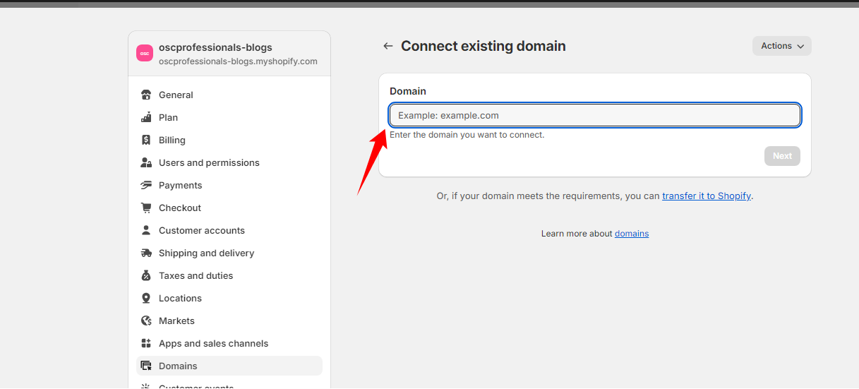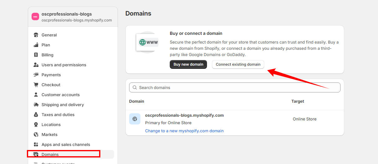 - Go to the Domains tab in your Shopify admin.