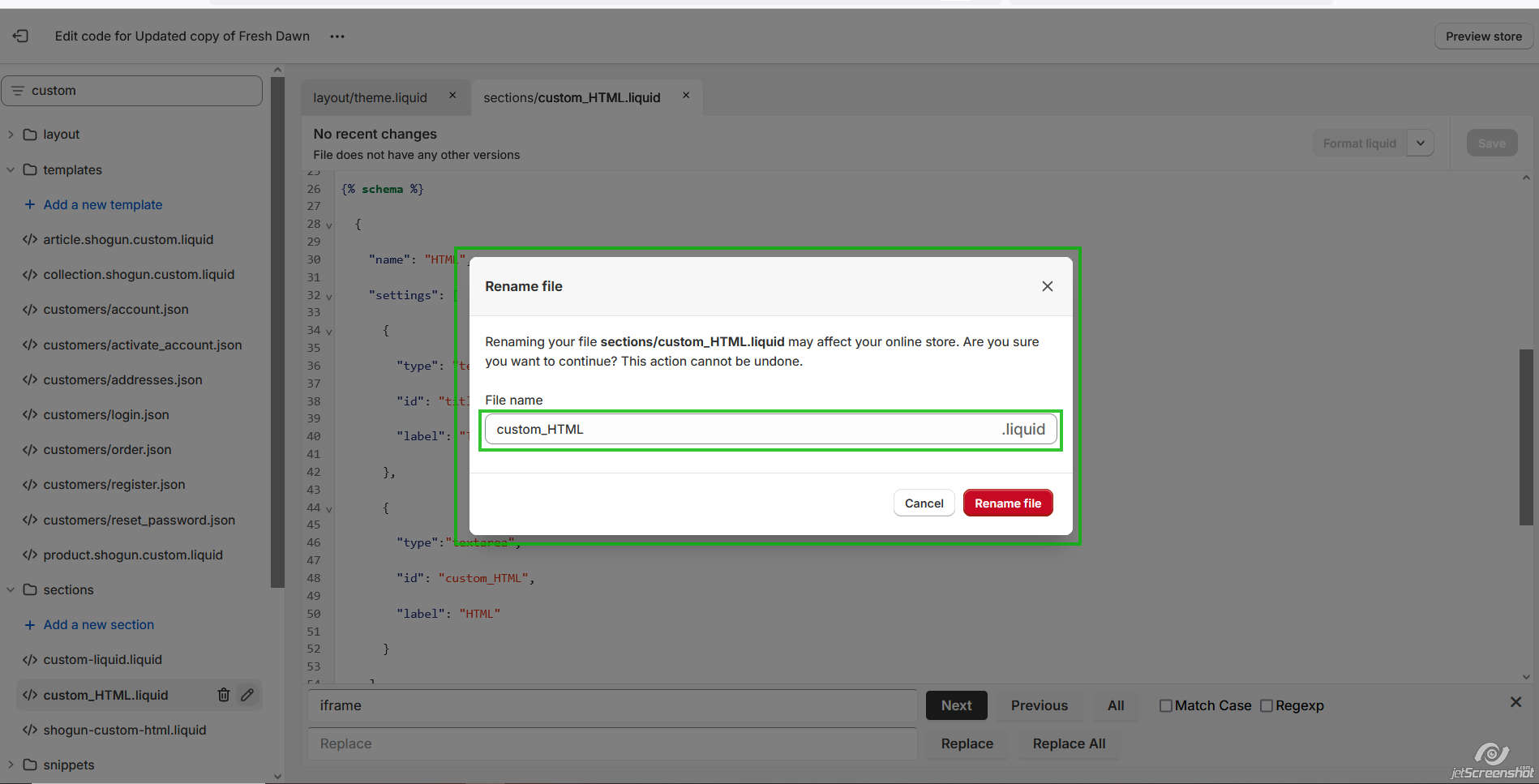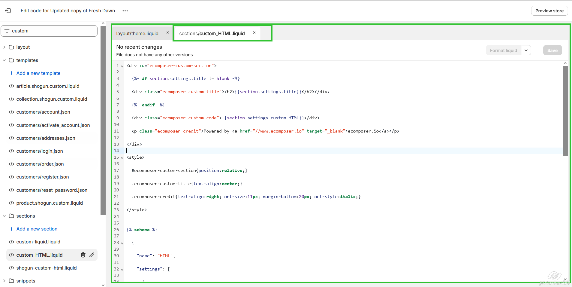 Open the ‘custom_HTML’ file you just created and add your custom code in Shopify. This is where you can integrate your desired HTML content.