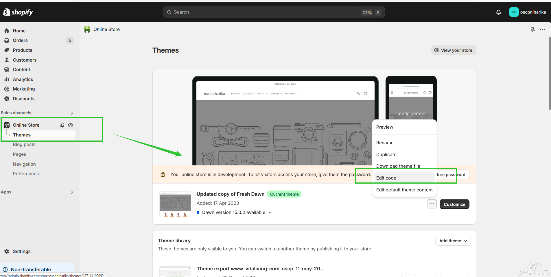 Go to your Shopify admin panel and select Online Store → Themes. Click on Edit Theme for the theme you wish to customize.