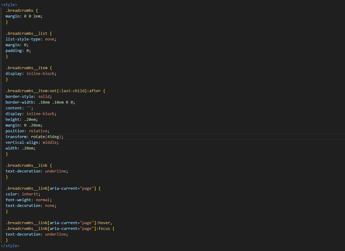 To create a clean, visually appealing breadcrumb layout, apply the following CSS styles. These styles ensure that your breadcrumbs are properly aligned and visually separated, enhancing the user experience.