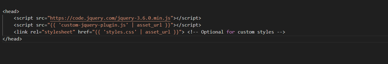 - Place the plugin in your Shopify theme’s assets directory, such as in assets/custom-jquery-plugin.js.