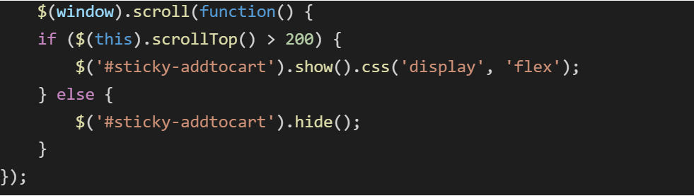 By default, the code puts the sticky element on display when the window is scrolled down 200 pixels. To change this behavior, in the JavaScript code, you can alter the number and make the sticky element pop up sooner or later.