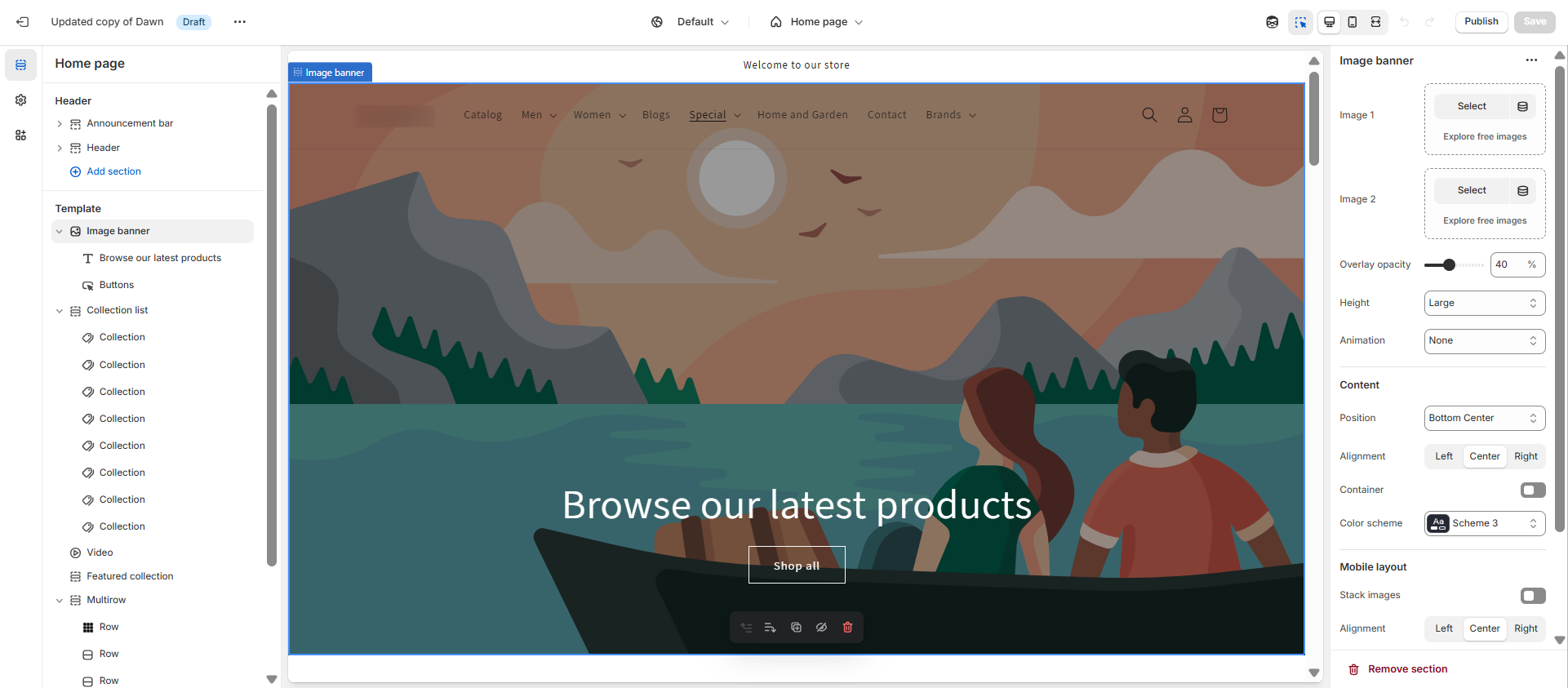- Online Store 2.0: Features modular architecture and app blocks. The system provides adaptable design structures together with an improved merchant toolset for store visual arrangement.
