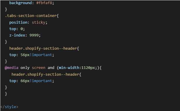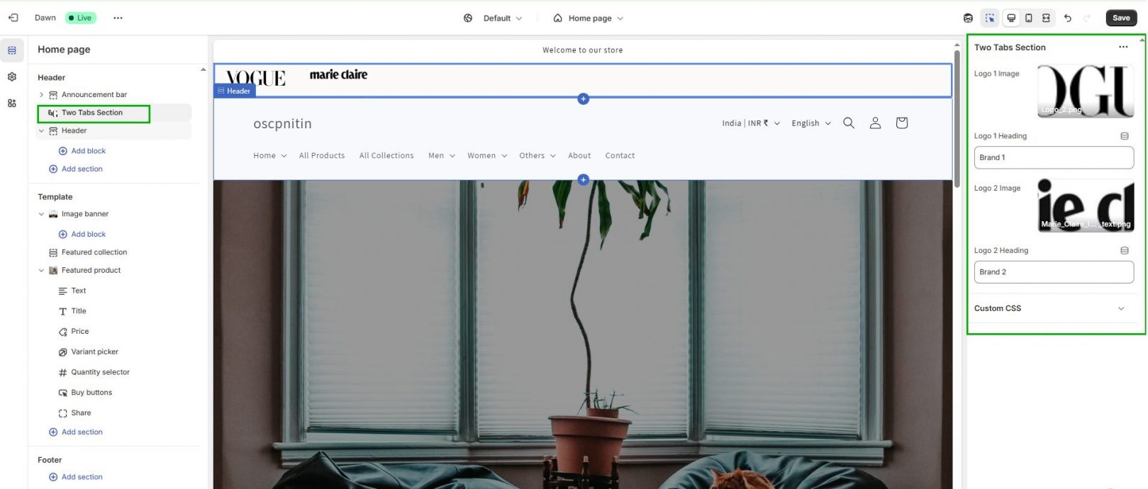 Via theme customization, drag and drop the Two Tabs Section into the header layout. This ensures sticky tab visibility and intuitive brand switching.